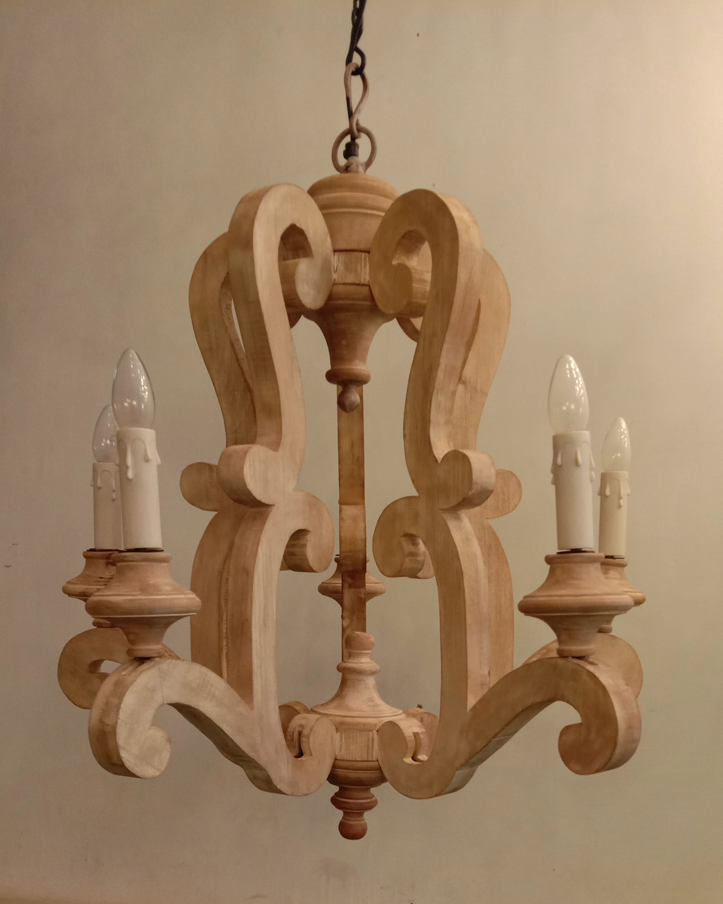 This beautiful chandelier with 5 bulb holders, created from a rich of Antique Finishing natural wood will enhance the beauty of your space